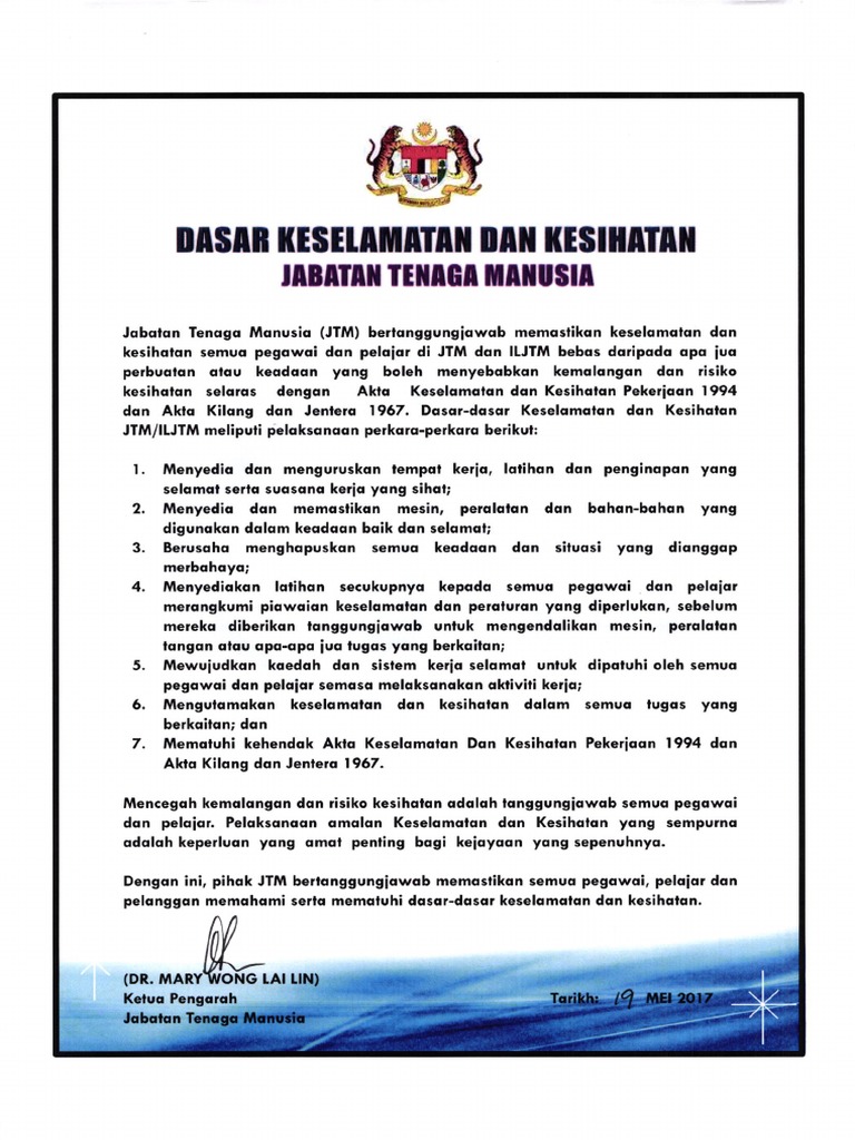 Jawatan Kuasa Keselamatan Kesihatan Pekerjaan Jkkp Portal Rasmi Majlis Bandaraya Johor Bahru Mbjb from www.mbjb.gov.my Melalui rancangan malaysia ketujuh (rmk 7), adtec shah alam dibina di kawasan perindustrian bukit kemuning di atas tapak seluas 40 ekar dan telah siap pembinaan sepenuhnya pada tahun 2000. Download lagu dasar dan keselamatan (8.49mb) dan streaming kumpulan lagu dasar dan keselamatan (8.49mb) mp3 terbaru di metrolagu dan nikmati hasil diatas adalah hasil pencarian dari anda dasar dan keselamatan mp3 dan menurut kami yang paling cocok adalah dasar dan. Keselamatan dan kesihatan pekerjaan (osh), yang biasanya dirujuk sebagai kesihatan dan keselamatan pekerjaan (ohs), kesihatan pekerjaan, atau keselamatan pekerjaan, ialah bidang pelbagai disiplin yang berkaitan dengan keselamatan, kesihatan, dan kebajikan orang di tempat kerja. Dan v untuk mengkaji semula dasar ini dan sistem pengurusan keselamatan. Pada julai 2001, adtec shah alam telah memulakan operasi dengan membuat pengambilan. Di sini saya nak kongsikan sedikit tentang apa itu dasar keselamatan dan kesihatan di tempat kerja. Secara umum keselamatan kerja dapat dikatakan sebagai ilmu dan penerapannya yang berkaitan dengan mesin, pesawat, alat kerja, bahan dan proses pengolahannya, landasan. Dasar keselamatan dan kesihatan pekerjaan ini hanya boleh digunakan setelah diluluskan oleh naib canselor universiti malaysia sabah (ums).